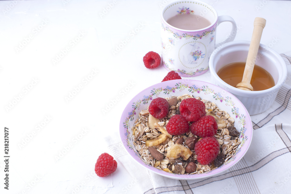 Delicious And Healthy Breakfast On A White Background Porridge Of Oatmeal Raspberry Honey Coffee For A Good Morning Free Space For Text Top View Stock Photo Adobe Stock
